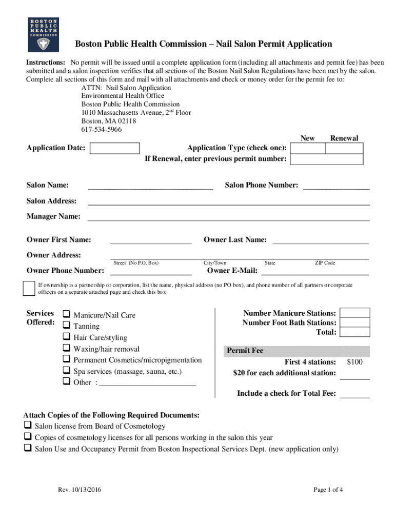 Boston Public Health Commission Nail Salon Permit Application Instructions: No permit will be issued until a complete application form (including all attachments and permit fee) has been submitted