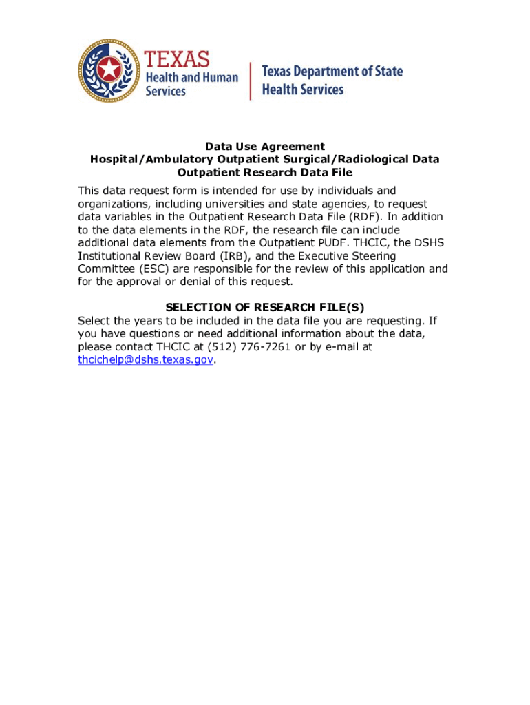 Data Use Agreement Hospital/Ambulatory Outpatient Surgical/Radiological Data Outpatient Research Data File This data request form is intended for use by individuals and organizations, including universities