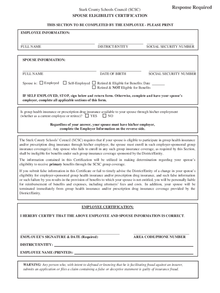 Response Required Stark County Schools Council (SCSI) SPOUSE ELIGIBILITY CERTIFICATIONS SECTION TO BE COMPLETED BY THE EMPLOYEE PLEASE PRINT EMPLOYEE INFORMATION:FULL REDISTRICT/ANTISOCIAL SECURITY