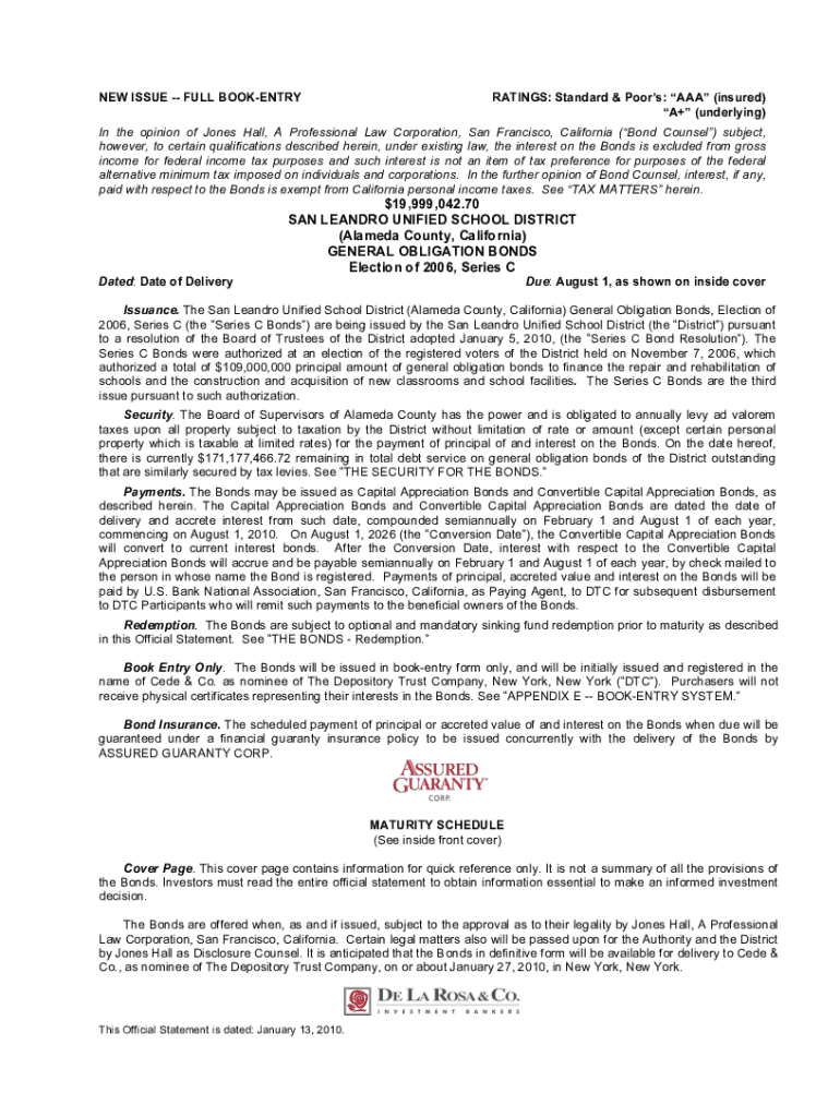 NEW ISSUE FULL BOOKENTRYRATINGS: Standard & Poor: AAA (insured) A+ (underlying)In the opinion of Jones Hall, A Professional Law Corporation, San Francisco, California (Bond Counsel) subject, however,