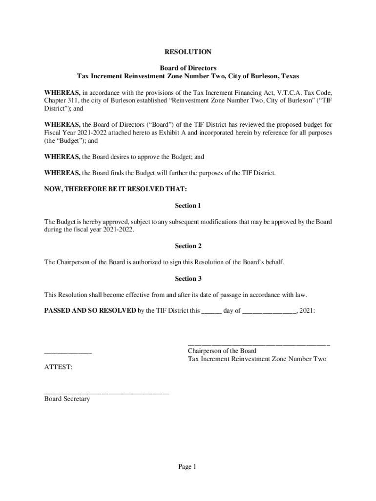 RESOLUTION Board of Directors Tax Increment Reinvestment Zone Number Two, City of Burleson, Texas WHEREAS, in accordance with the provisions of the Tax Increment Financing Act, V.T.C.A. Tax Code,