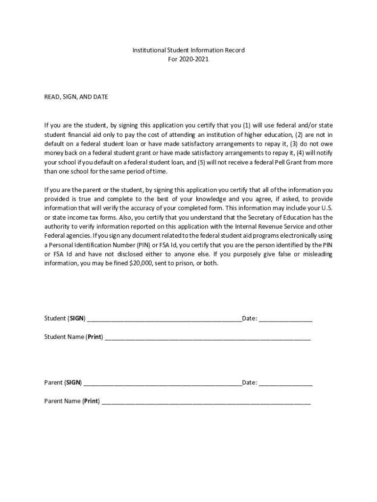 Get the free Institutional Student Information Record For 2020-2021 READ ...