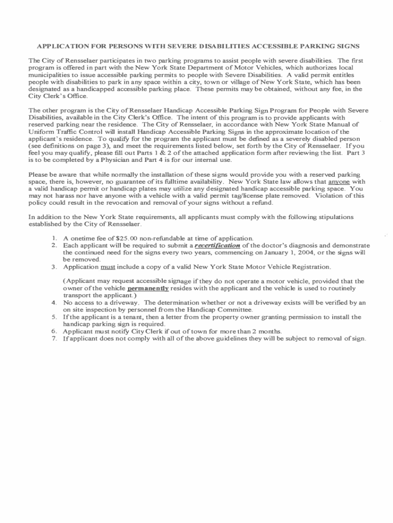 APPLICATION FOR PERSONS WITH SEVERE DISABILITIES ACCESSIBLE PARKING SIGNS The City of Rensselaer participates in two parking programs to assist people with severe disabilities. The first program is