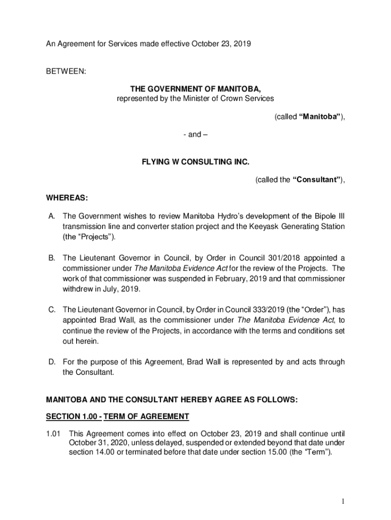 An Agreement for Services made effective October 23, 2019BETWEEN: THE GOVERNMENT OF MANITOBA, represented by the Minister of Crown Services (called Manitoba), and FLYING W CONSULTING INC. (called