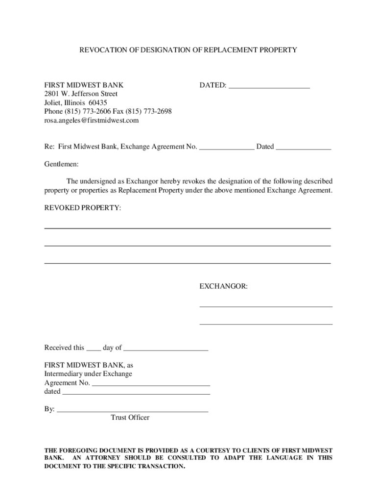 REVOCATION OF DESIGNATION OF REPLACEMENT PROPERTYFIRST MIDWEST BANK 2801 W. Jefferson Street Joliet, Illinois 60435 Phone (815) 7732606 Fax (815) 7732698 Rosa. Angels firstmidwest.combated: Re: First