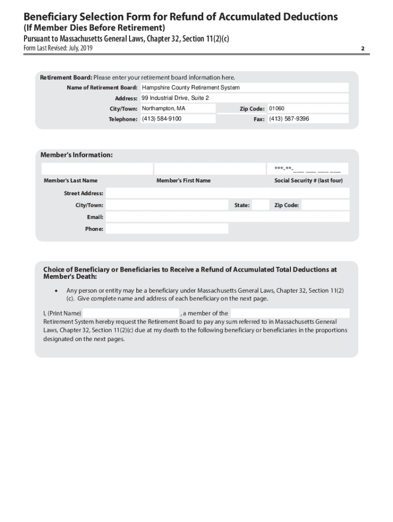 PUBLIC EMPLOYEE RETIREMENT ADMINISTRATION COMMISSION FIVE MIDDLESEX AVENUE, SUITE 304 SOMERVILLE, MA 02145IntroductionBeneficiary Selection Form for Refund of Accumulated Deductions (If Member Dies
