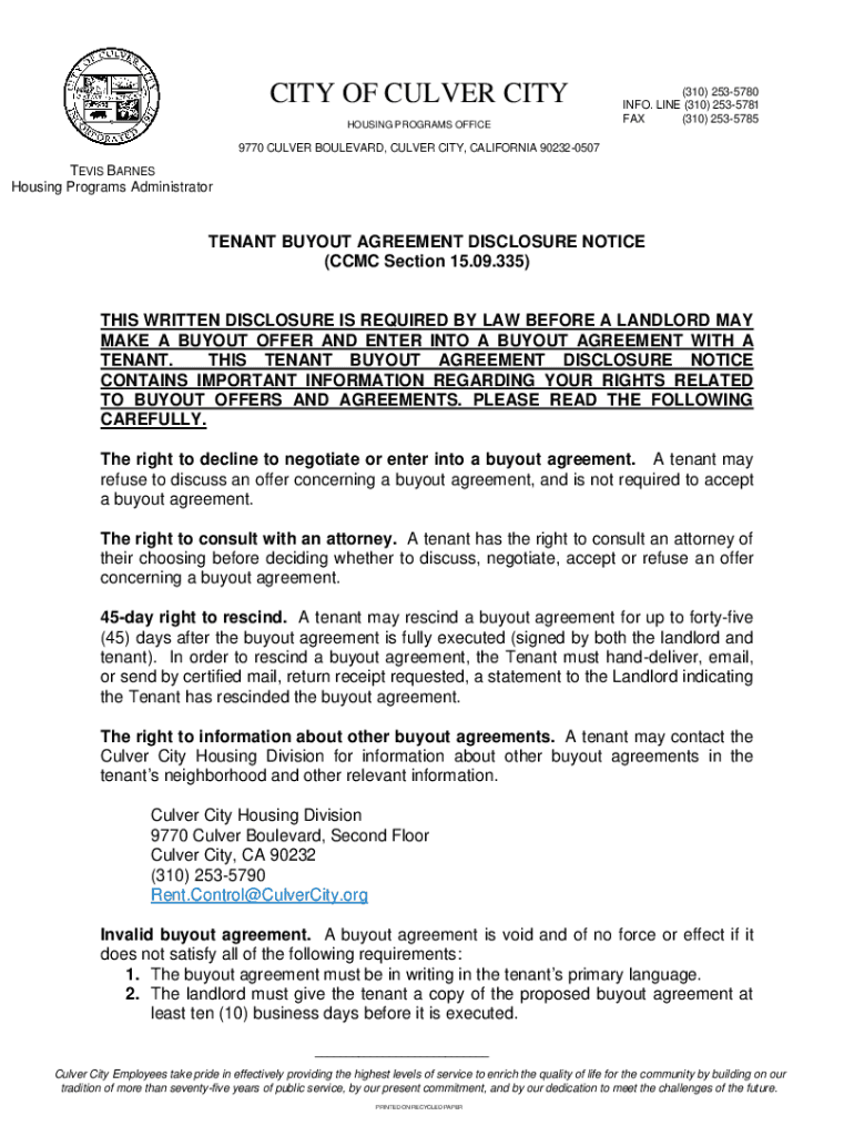 CITY OF CULVER CITY HOUSING PROGRAMS OFFICE(310) 2535780 INFO. LINE (310) 2535781 FAX (310) 25357859770 CULVER BOULEVARD, CULVER CITY, CALIFORNIA 902320507TEVIS BARNES Housing Programs AdministratorTENANT