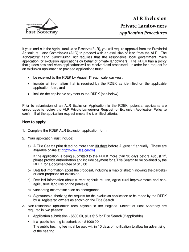 ALR Exclusion Private Landowners Application Procedures your land is in the Agricultural Land Reserve (ALR), you will require approval from the Provincial Agricultural Land Commission (ALC) to proceed