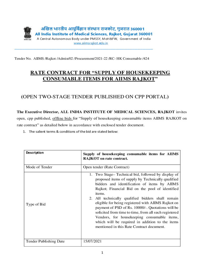 , 360001 All India Institute of Medical Sciences, Rajkot, Gujarat 360001 A Central Autonomous Body under PUSSY, Moscow, Government of India www.aiimsrajkot.edu.in Tender No. AIMS /Rajkot /Admin/02