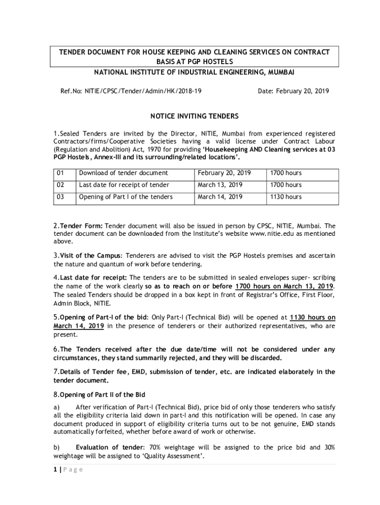 TENDER DOCUMENT FOR Housekeeping AND CLEANING SERVICES ON CONTRACT BASIS AT PGP HOSTELS NATIONAL INSTITUTE OF INDUSTRIAL ENGINEERING, MUMBAI Ref.No: NIT IE/CPC/Tender/Admin/HK/201819Date: February