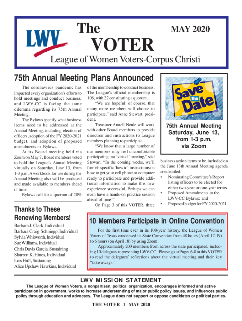 They 2020VOTER League of Women VotersCorpus Christi 75th Annual Meeting Plans Announced The coronavirus pandemic has impacted every organization's efforts to hold meetings and conduct business, and