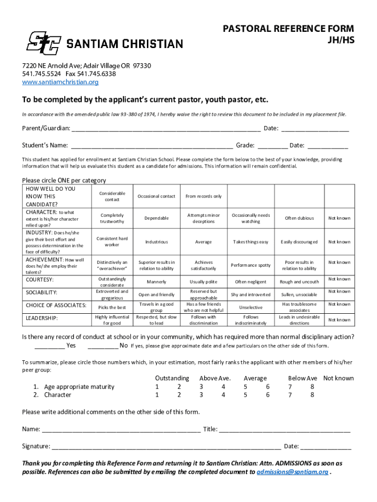 PASTORAL REFERENCE FORM JR/HS 7220 NE Arnold Ave; Aware Village OR 97330 541.745.5524 Fax 541.745.6338 www.santiamchristian.orgTo be completed by the applicants current pastor, youth pastor, etc.