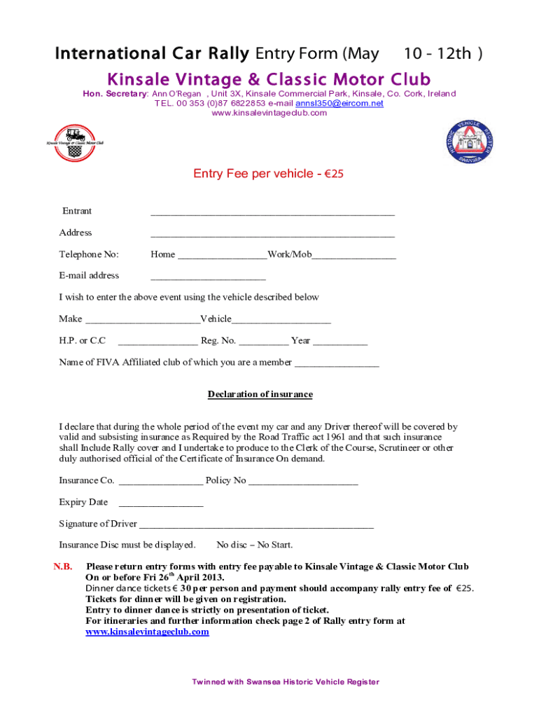 International Car Rally Entry Form (May10 12th)K ins ale Vintage & C lass IC Motor C Luzon. Secretary: Ann Organ, Unit 3X, Kin sale Commercial Park, Kin sale, Co. Cork, Ireland TEL. 00 353 (0)87 6822853