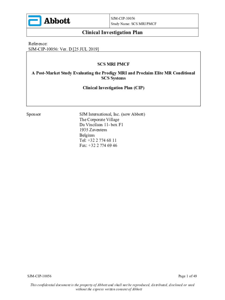 SJMCIP10056 Study Name: SCS MRI Preclinical Investigation Plan Reference: SJMCIP10056: Very. D 25 JUL 2019 SCS MRI PMC A Postmarked Study Evaluating the Prodigy MRI and Proclaim Elite MR Conditional