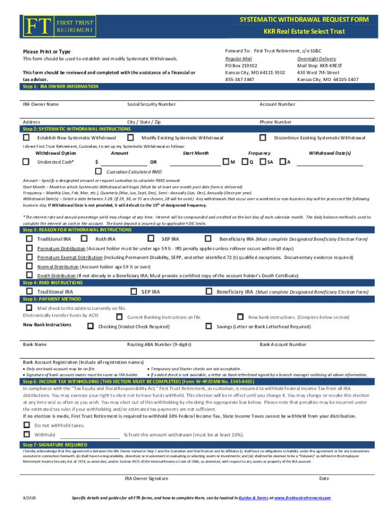 SYSTEMATIC WITHDRAWAL REQUEST FORM KKR Real Estate Select Trust Please Print or TypeForward To: First Trust Retirement, c/o SSC Regular Mail Overnight Delivery PO Box 219302 Mail Stop: ARREST Kansas