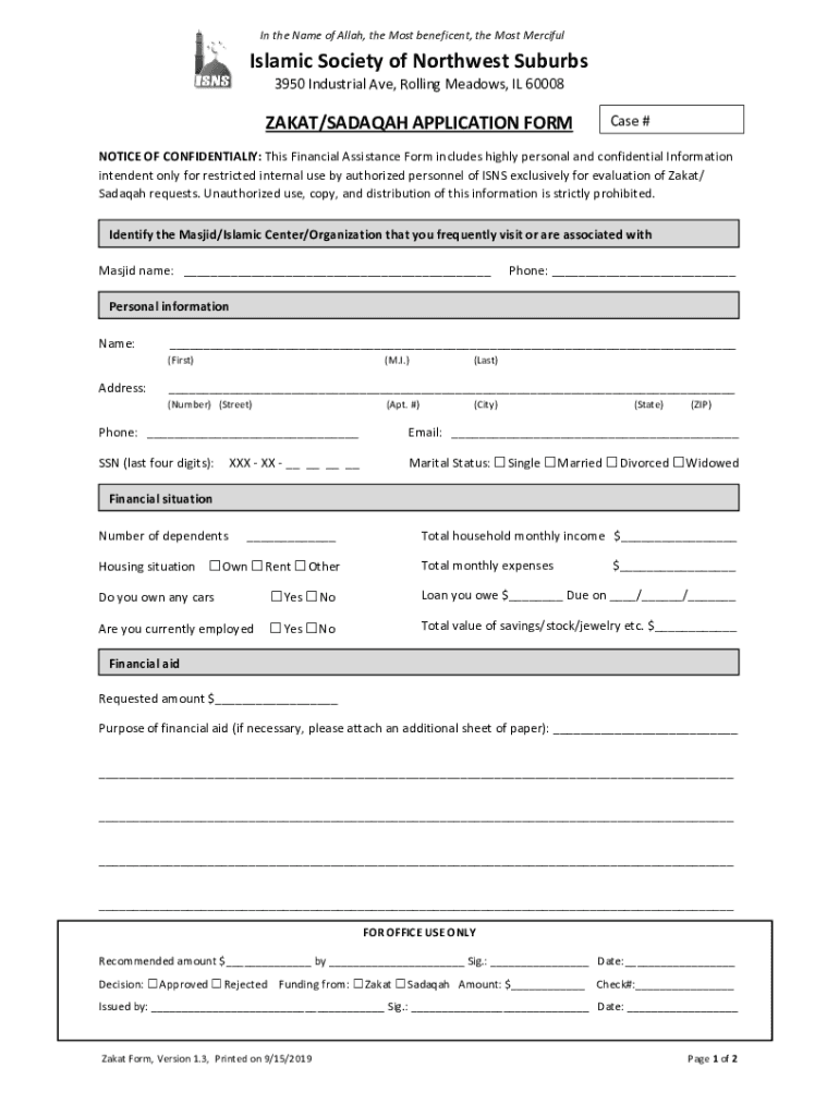 In the Name of Allah, the Most beneficent, the Most Merciful Islamic Society of Northwest Suburbs 3950 Industrial Ave, Rolling Meadows, IL 60008ZAKAT/SARAH APPLICATION FORM Case #NOTICE OF CONFIDENTIALITY: