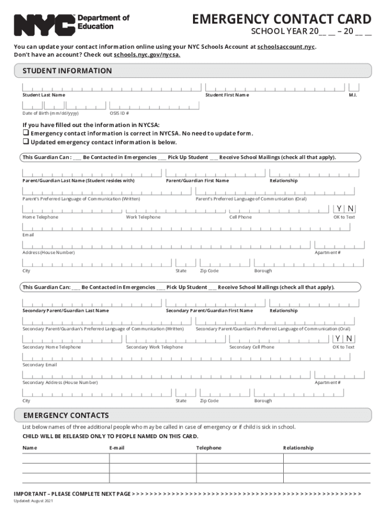 EMERGENCY CONTACT PRESCHOOL YEAR 20 20 You can update your contact information online using your NYC Schools Account at schools account.NYC. Don't have an account? Check out schools.nyc.gov/nycsa.STUDENT
