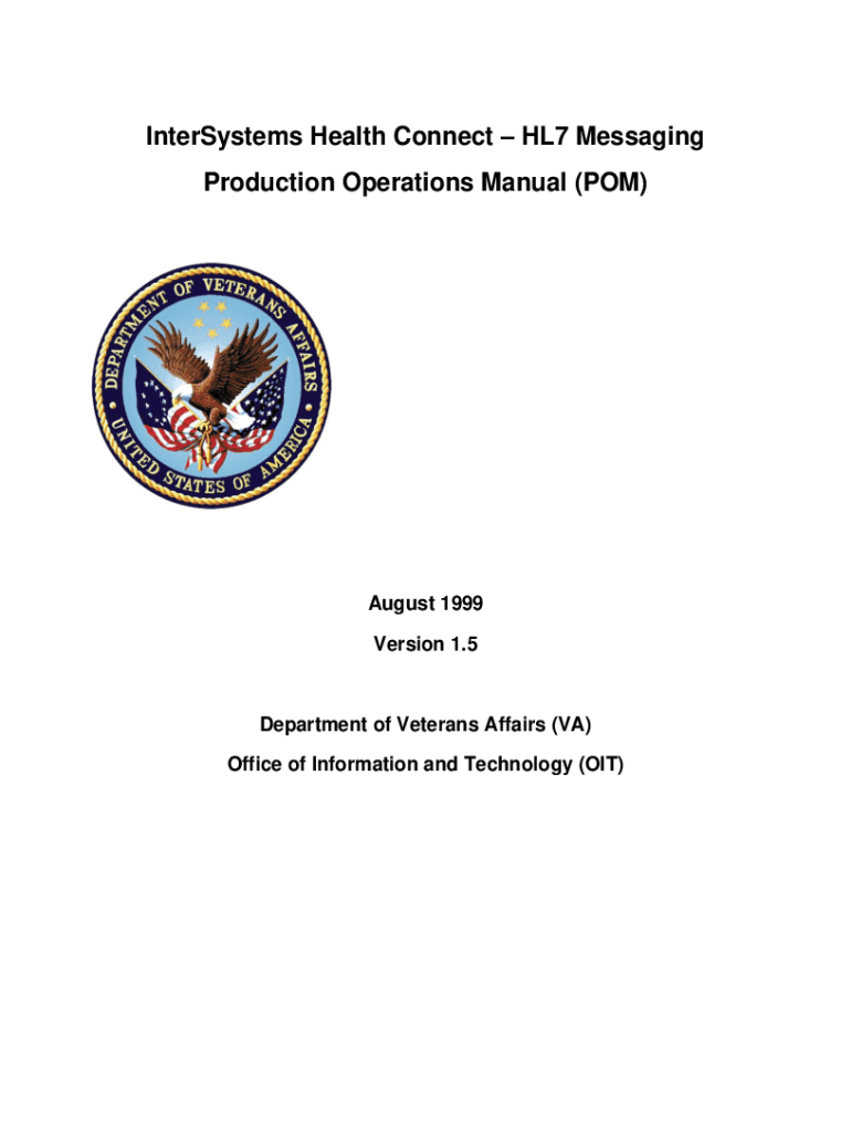 Interstates Health Connect HL7 Messaging Production Operations Manual (POM)August 1999 Version 1.5Department of Veterans Affairs (VA) Office of Information and Technology (OIT)Revision History DateVersionDescriptionAuthor08/06/19991.5Tech