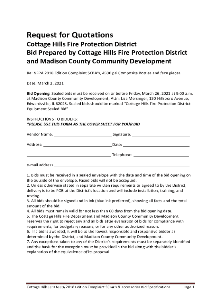 Request for Quotations Cottage Hills Fire Protection District Bid Prepared by Cottage Hills Fire Protection District and Madison County Community Development Re: NFPA 2018 Edition Complaint Scubas,