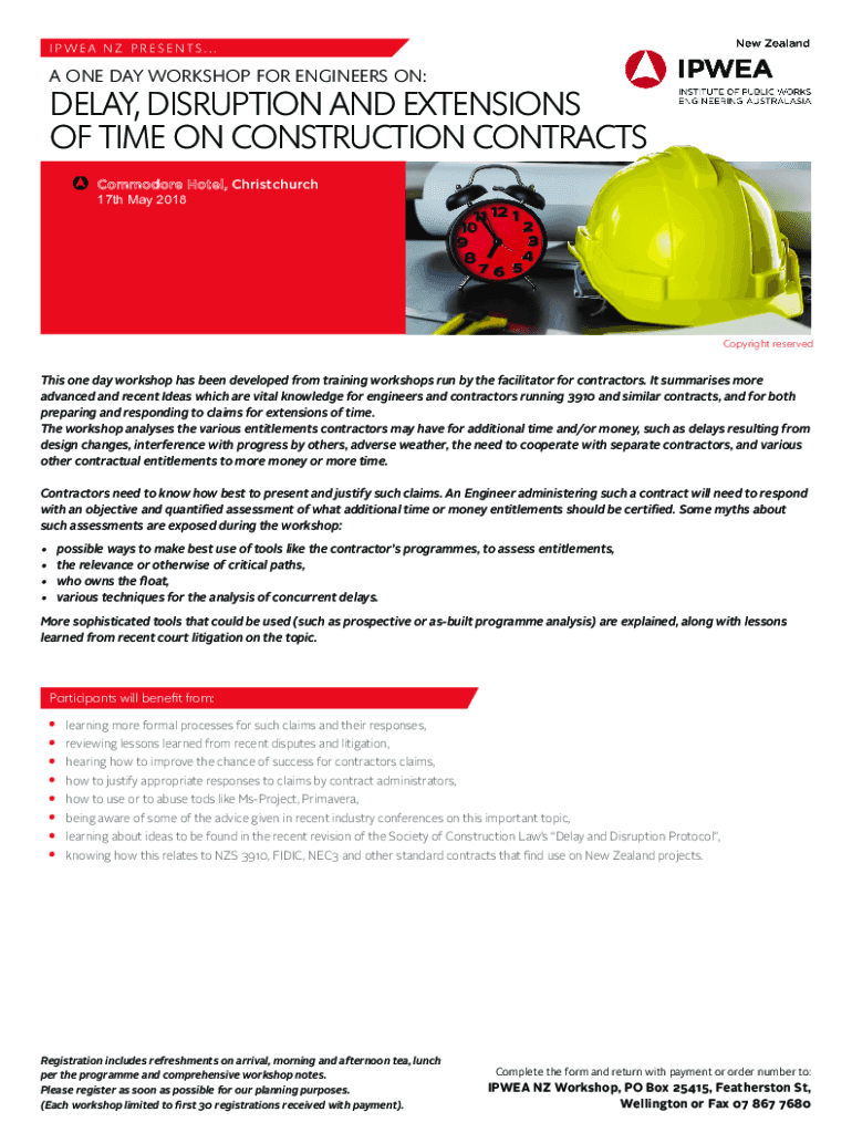 IDEA NZ PRESENTS... A ONE-DAY WORKSHOP FOR ENGINEERS ON:DELAY, DISRUPTION AND EXTENSIONS OF TIME ON CONSTRUCTION CONTRACTS Commodore Hotel, Christchurch 17th May 2018Copyright reservedness one day