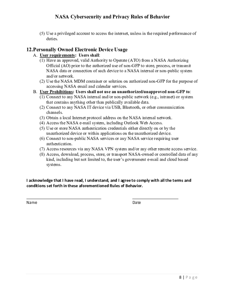 National Aeronautics and Space Administration Headquarters Washington, DC 205460001NASA Cybersecurity and Privacy Rules of Behavior 1. Introduction. The NASA Cybersecurity and Privacy Rules of Behavior