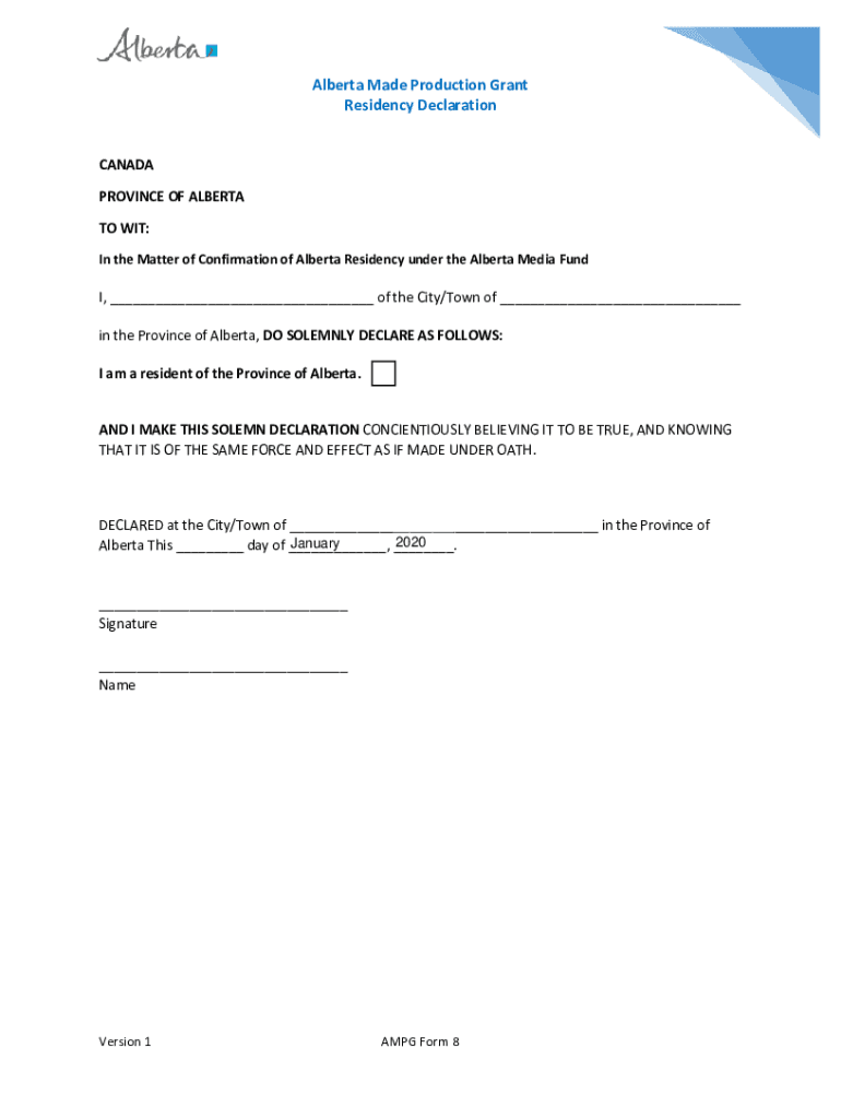 Alberta Made Production Grant Residency Declaration CANADA PROVINCE OF ALBERTA TO WIT: In the Matter of Confirmation of Alberta Residency under the Alberta Media Funds, of the City/Town of in the