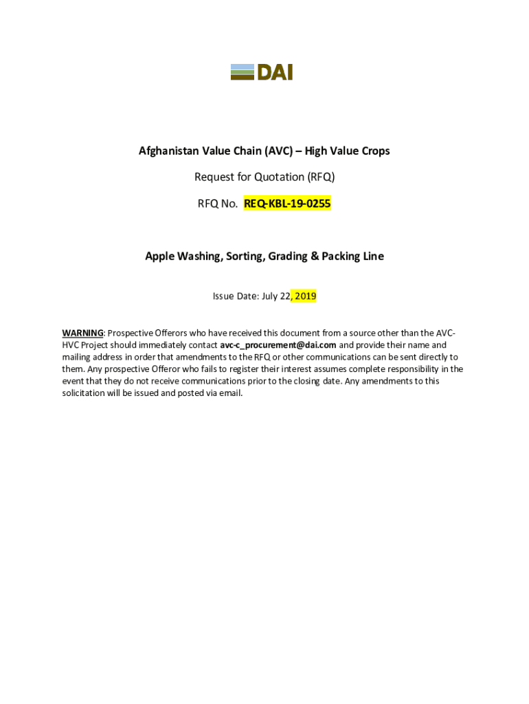 Afghanistan Value Chain (AVC) High Value Crops Request for Quotation (RFQ) RFQ No. REQKBL190255Apple Washing, Sorting, Grading & Packing Line Issue Date: July 22, 2019WARNING: Prospective Offers who
