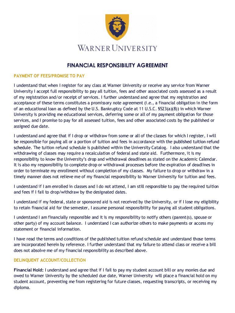 FINANCIAL RESPONSIBILITY AGREEMENT PAYMENT OF FEES/PROMISE TO PAY I understand that when I register for any class at Warner University or receive any service from Warner University I accept full responsibility