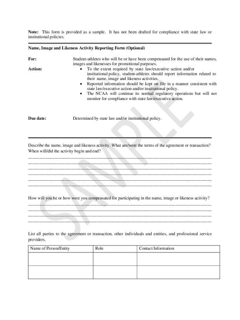 Note: This form is provided as a sample. It has not been drafted for compliance with state law or institutional policies. Name, Image and Likeness Activity Reporting Form (Optional) For: Action:Due