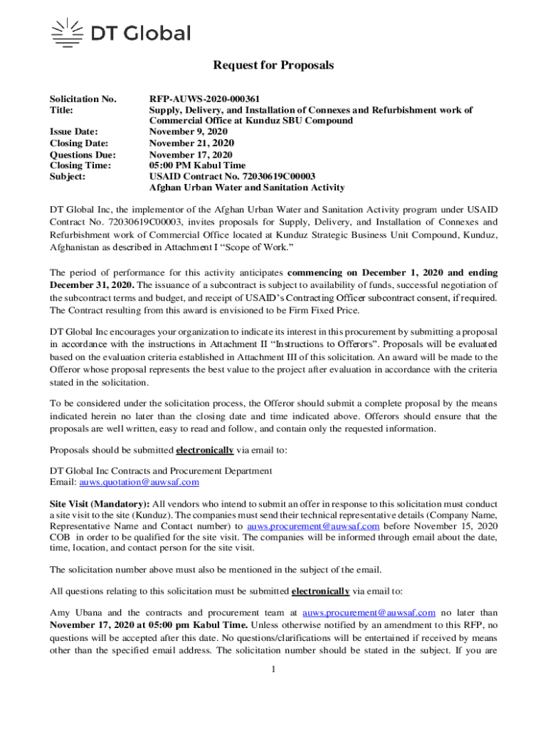Request for Proposals Solicitation No. Title: Issue Date: Closing Date: Questions Due: Closing Time: Subject:RFPAUWS2020000361 Supply, Delivery, and Installation of Conn exes and Refurbishment work