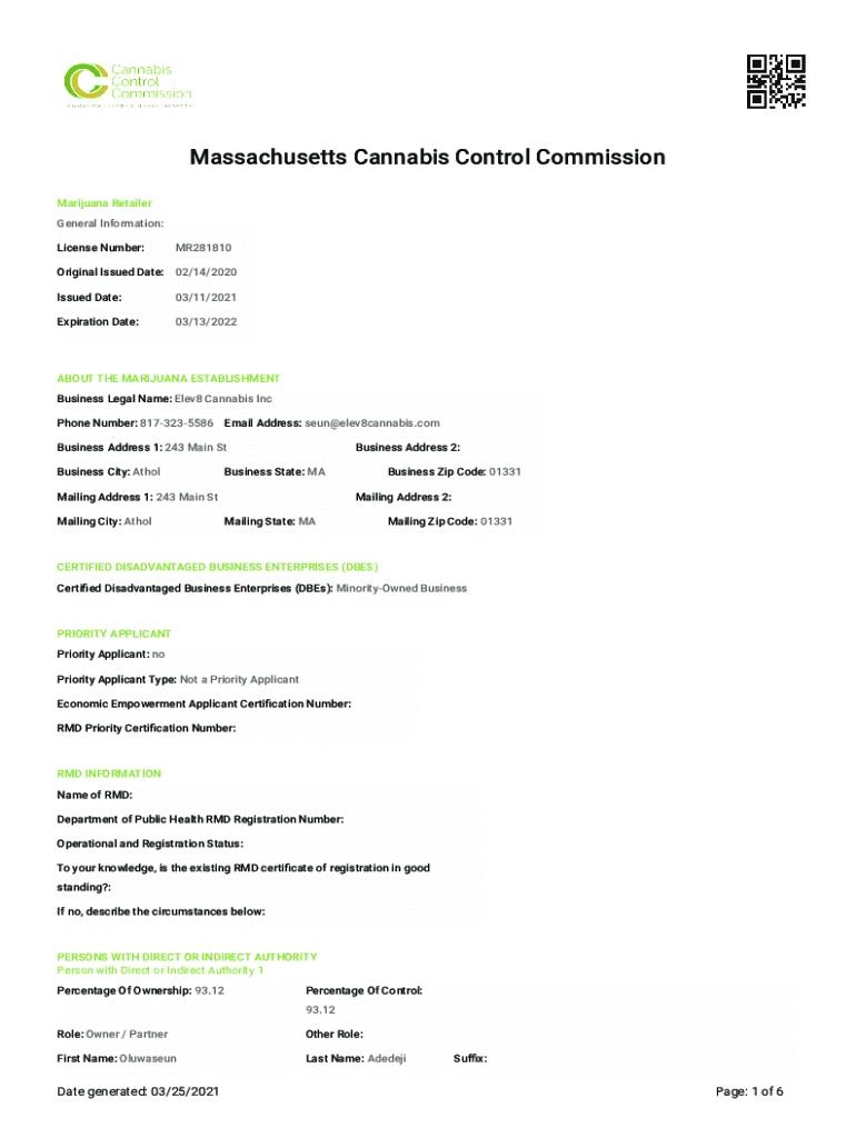 Massachusetts Cannabis Control Commission Marijuana Retailer General Information: License Number:MR281810Original Issued Date: 02/14/2020 Issued Date:03/11/2021Expiration Date:03/13/2022ABOUT THE