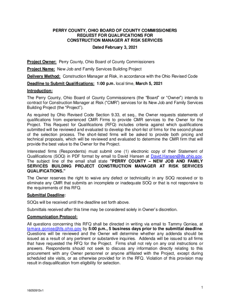 PERRY COUNTY, OHIO BOARD OF COUNTY COMMISSIONERS REQUEST FOR QUALIFICATIONS FOR CONSTRUCTION MANAGER AT RISK SERVICES Dated February 3, 2021, Project Owner: Perry County, Ohio Board of County Commissioners
