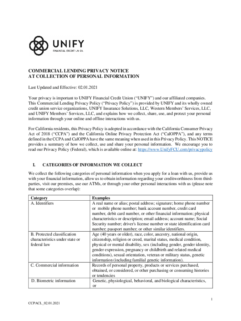 COMMERCIAL LENDING PRIVACY NOTICE AT COLLECTION OF PERSONAL INFORMATION Last Updated and Effective: 02.01.2021 Your privacy is important to UNIFY Financial Credit Union (UNIFY) and our affiliated