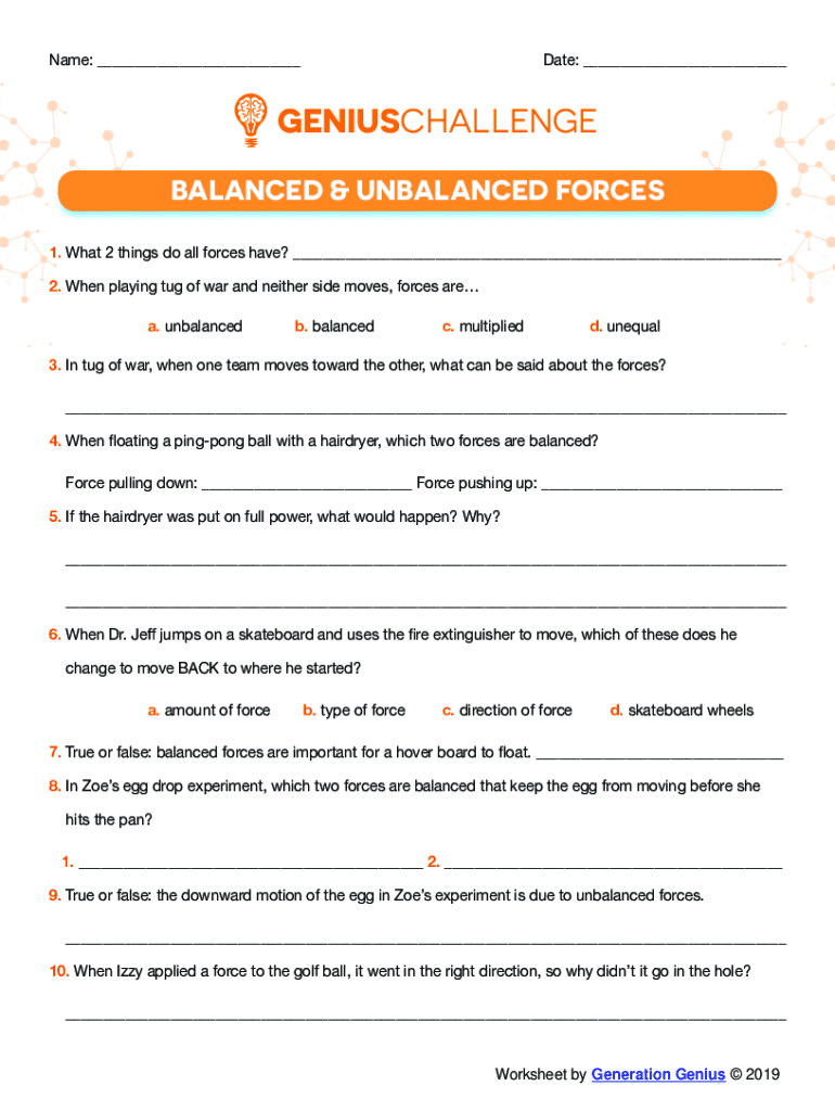 Name: Date: GENIUSCHALLENGE BALANCED & UNBALANCED FORCES 1. What 2 things do all forces have? 2. When playing tug of war and neither side moves, forces area. Unbalanced. Balanced. Multiplied. Unequal3.