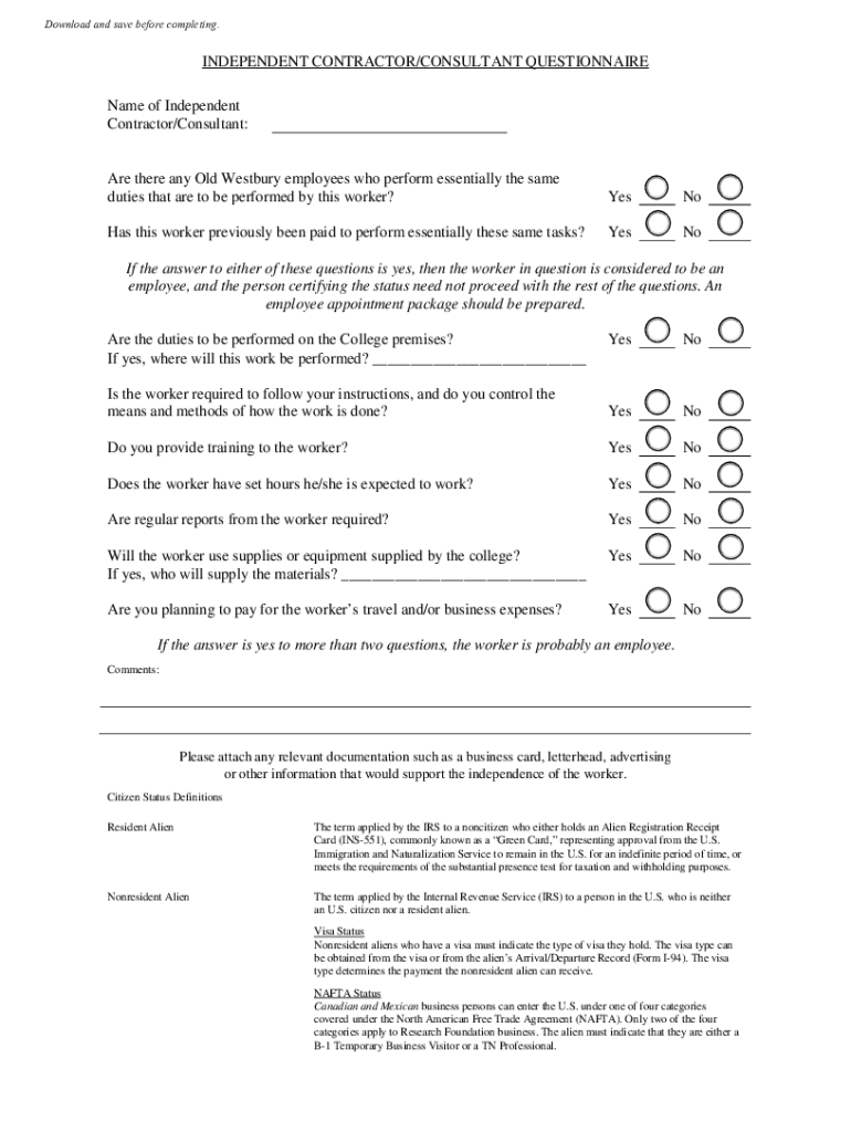 Get the free Independent Contractor Consultant Questionnaire - SUNY Old ...