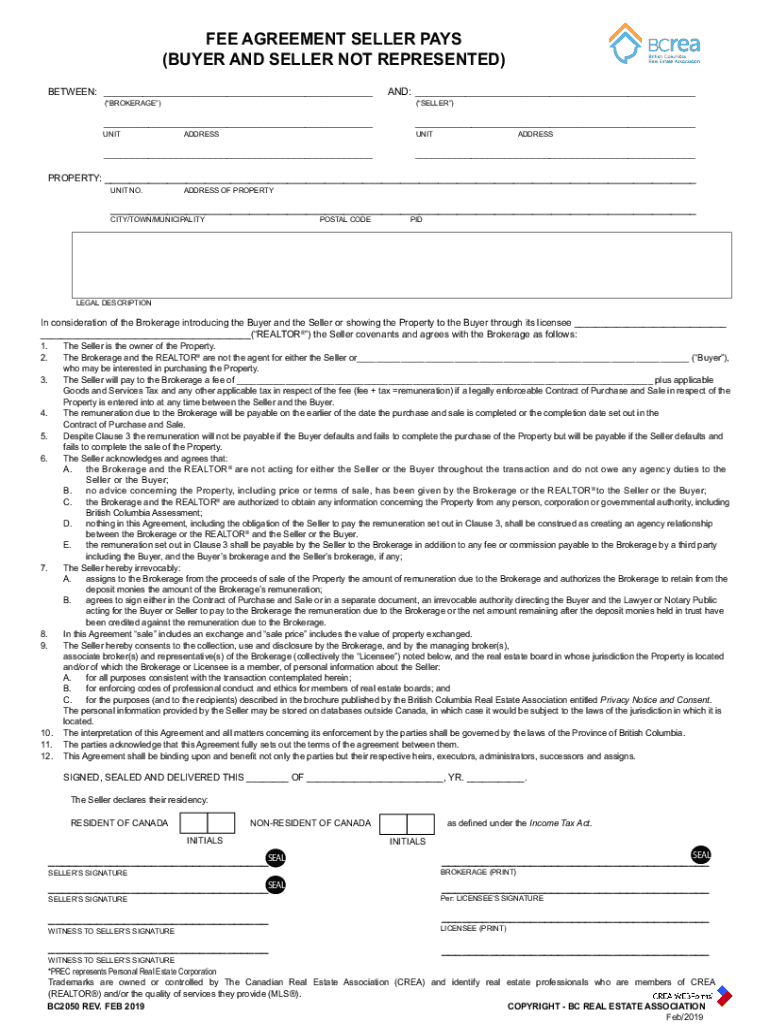 FEE AGREEMENT SELLER PAYS (BUYER AND SELLER NOT REPRESENTED) BETWEEN: (BROKERAGE)(SELLER) UNITUNITADDRESS PROPERTY:AND: ADDRESS UNIT NO.ADDRESS OF PROPERTY CITY/TOWN/MUNICIPALITYPOSTAL CODEPIDLEGAL