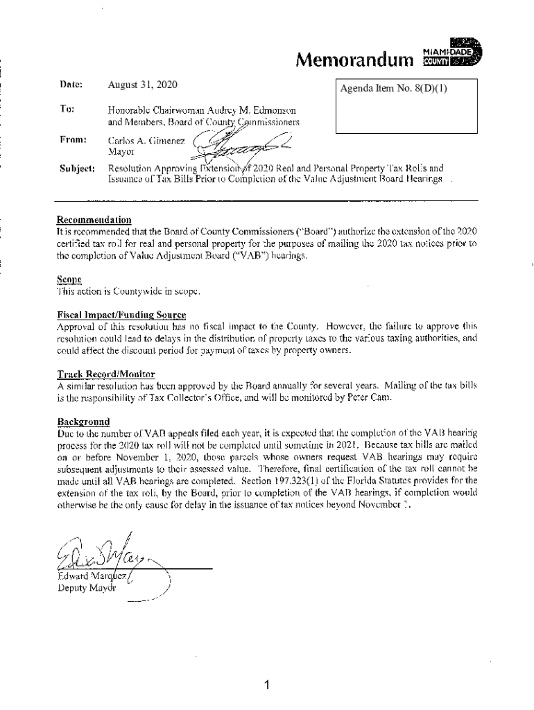 August 31, 2020Agenda Item No. 8(D)(1)1August 31, 20208(D)(1)2Approved Veto Override MayorAgenda Item No. 8(D)(1) 83120RESOLUTION NO. RESOLUTION APPROVING EXTENSION OF 2020 REAL AND PERSONAL PROPERTY