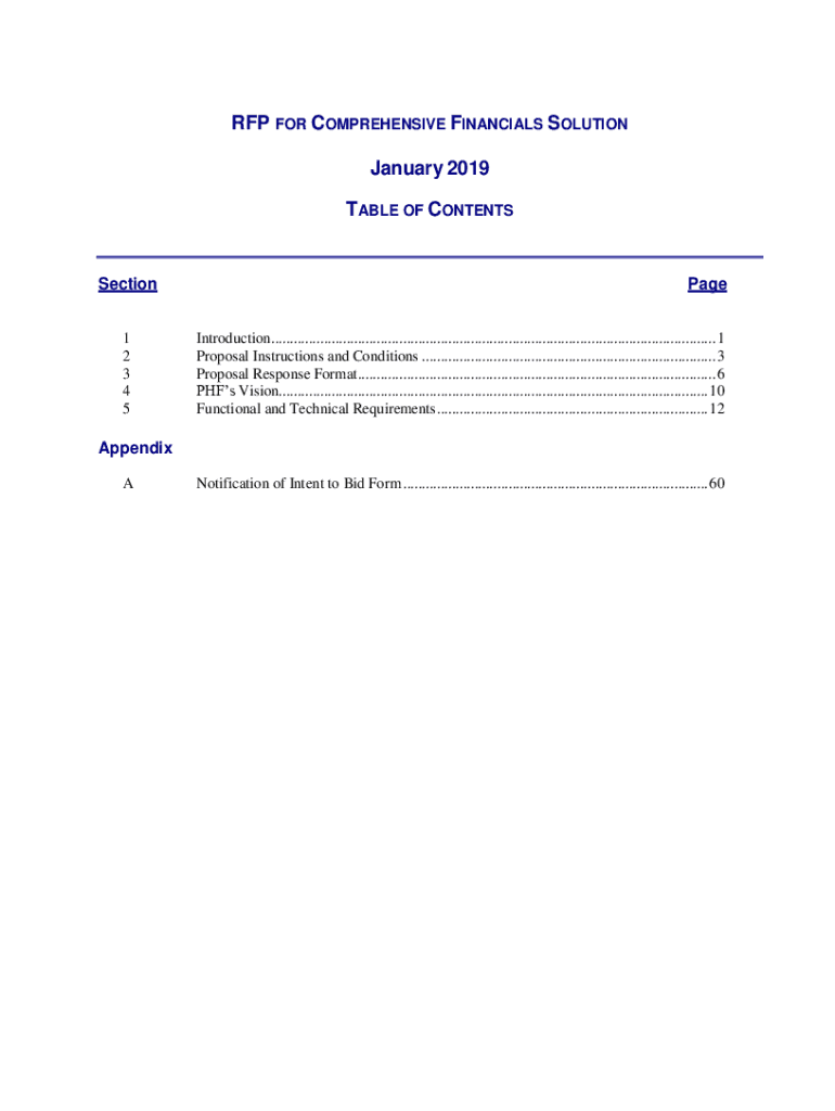 RFP FOR COMPREHENSIVE FINANCIALS SOLUTION January 2019 TABLE OF CONTENTSSection 1 2 3 4 5Page Introduction......................................................................................................................