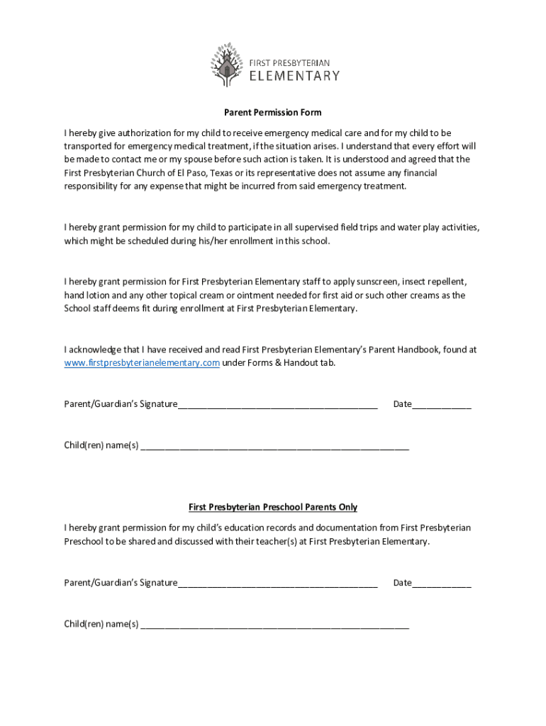 Parent Permission Form I hereby give authorization for my child to receive emergency medical care and for my child to be transported for emergency medical treatment, if the situation arises. I understand