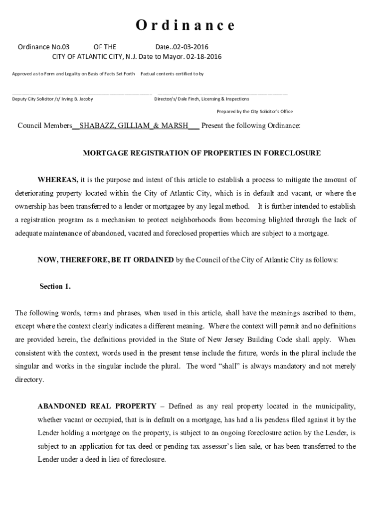 Ordinance No.03 OF THE Date.02032016 CITY OF ATLANTIC CITY, N.J. Date to Mayor. 02182016 Approved as to Form and Legality on Basis of Facts Set ForthFactual contents certified to by Deputy City Solicitor