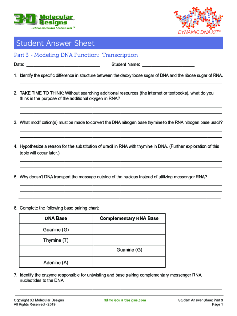 ...where molecules become real DYNAMIC DNA KIT DYNAMIC DNA Student Answer Sheet Part 3 Modeling DNA Function: Transcription Date: Student Name: 1. Identify the specific difference in structure between