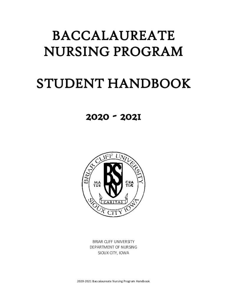 BACCALAUREATE NURSING PROGRAM STUDENT HANDBOOK 2020 2021BRIAR CLIFF UNIVERSITY DEPARTMENT OF NURSING SIOUX CITY, IOWA20202021 Baccalaureate Nursing Program HandbookBRIAR CLIFF UNIVERSITY DEPARTMENT