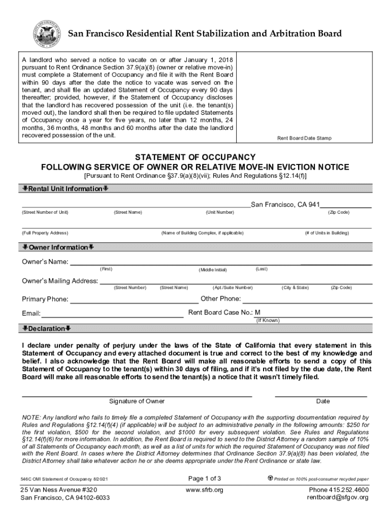 San Francisco Residential Rent Stabilization and Arbitration Board A landlord who served a notice to vacate on or after January 1, 2018, pursuant to Rent Ordinance Section 37.9(a)(8) (owner or relative