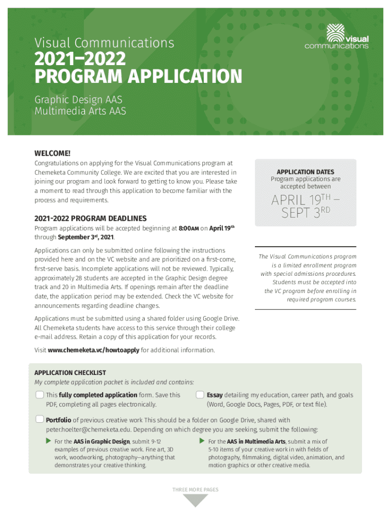 Visual Communications20212022 PROGRAM APPLICATION Graphic Design AAS Multimedia Arts WELCOME! Congratulations on applying for the Visual Communications program at Cheeked Community College. We are