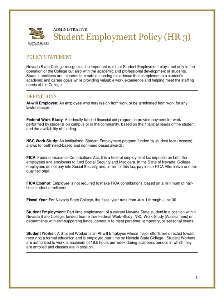 ADMINISTRATIVEStudent Employment Policy (HR 3) POLICY STATEMENT Nevada State College recognizes the important role that Student Employment plays, not only in the operation of the College but also