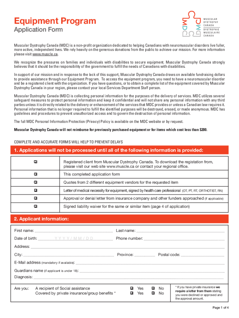 Equipment Program Application Corpuscular Dystrophy Canada (MDC) is a nonprofit organization dedicated to helping Canadians with neuromuscular disorders live fuller, more active, independent lives.