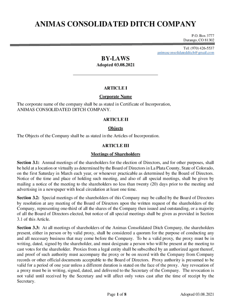 ANIMAS CONSOLIDATED DITCH COMPANY P.O. Box 3777 Durango, CO 81302 Tel: (970) 4265537 animasconsolidatedditch Gmail. Bylaws Adopted 03.08.2021 ARTICLE I Corporate Name The corporate name of the company