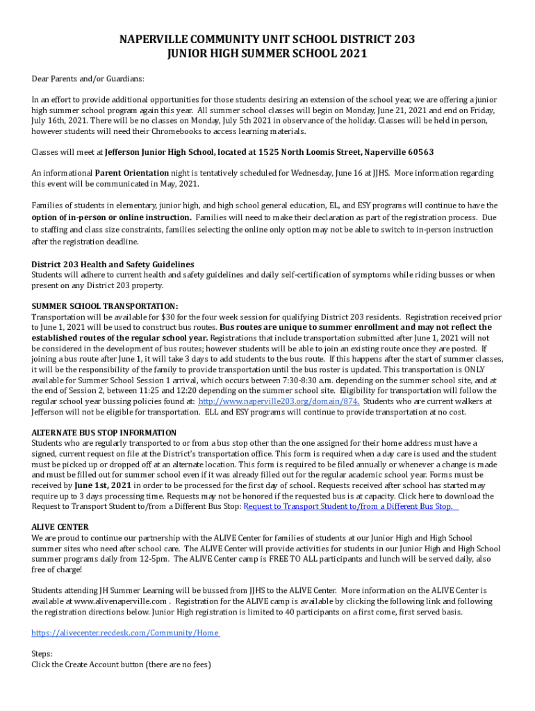 NAPERVILLECOMMUNITYUNITSCHOOLDISTRICT203JUNIORHIGHSUMMERSCHOOL2021Dear Parents and/or Guardians: In an effort to provide additional opportunities for those students desiring an extension of the school