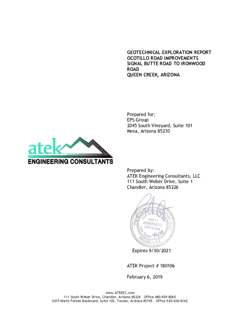 GEOTECHNICAL EXPLORATION REPORT COSTELLO ROAD IMPROVEMENTS SIGNAL BUTTE ROAD TO IRONWOOD ROAD QUEEN CREEK, ARIZONAPrepared for: EPS Group 2045 South Vineyard, Suite 101 Mesa, Arizona 85210Prepared