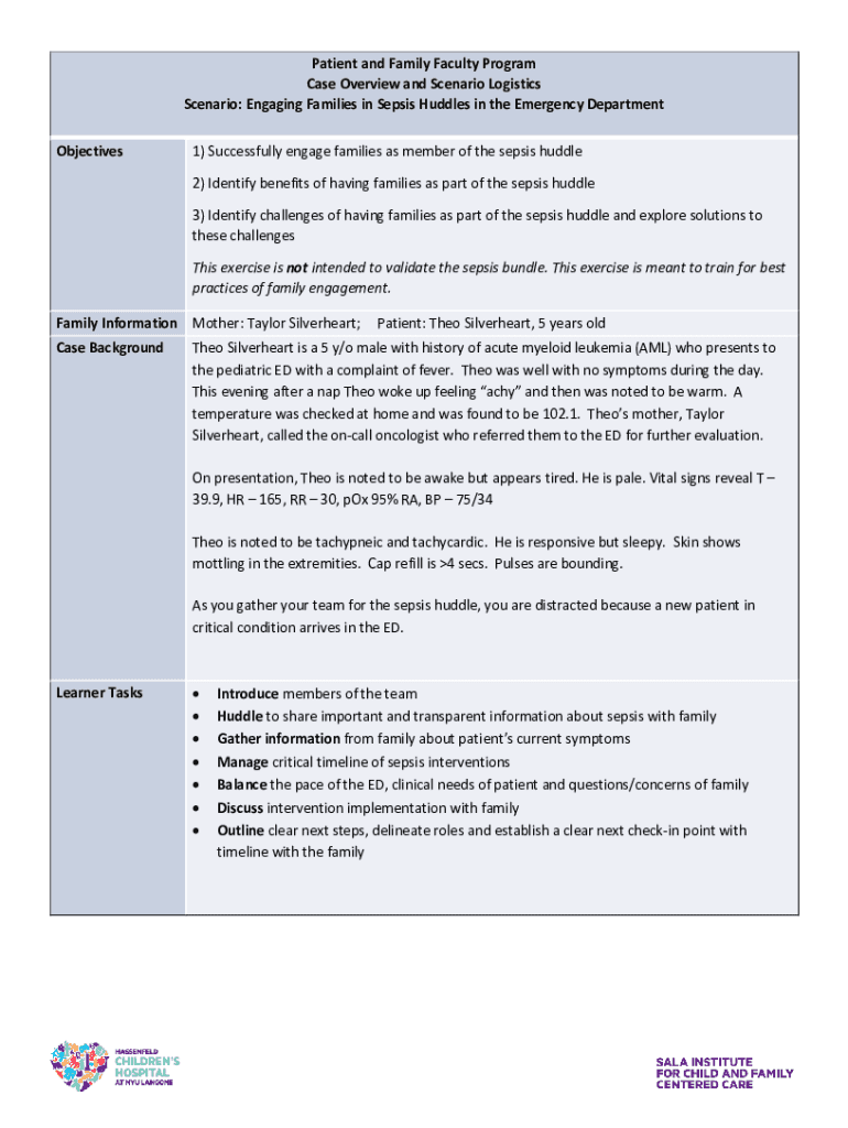 Patient and Family Faculty Program Case Overview and Scenario Logistics Scenario: Engaging Families in Sepsis Huddles in the Emergency Department Objectives1) Successfully engage families as member